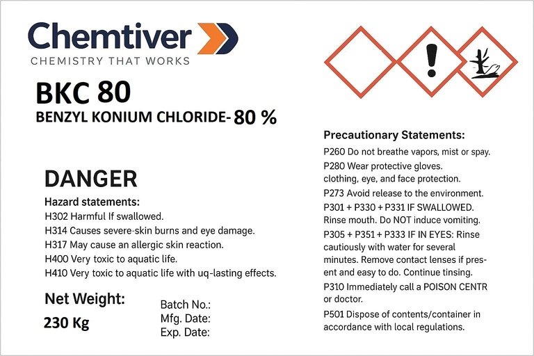 It is commonly used in paints and coatings, water treatment, agriculture, disinfectants, and industrial formulations due to its excellent compatibility and long-lasting performance. BKC 80 ensures extended shelf life and prevents microbial contamination in both aqueous and non-aqueous systems.