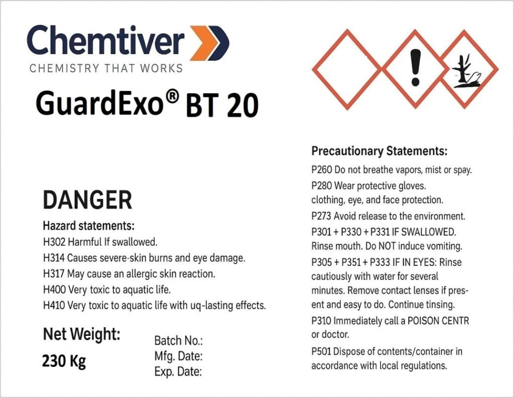 GuardExo BT 20 by Chemtiver is a high-performance in-can preservative containing 1,2-Benzisothiazolin-3-one (BIT) formulated in a glycol-based solution for excellent stability and easy incorporation. The glycol carrier enhances solubility, improves compatibility, and ensures uniform dispersion in a wide range of water-based systems.